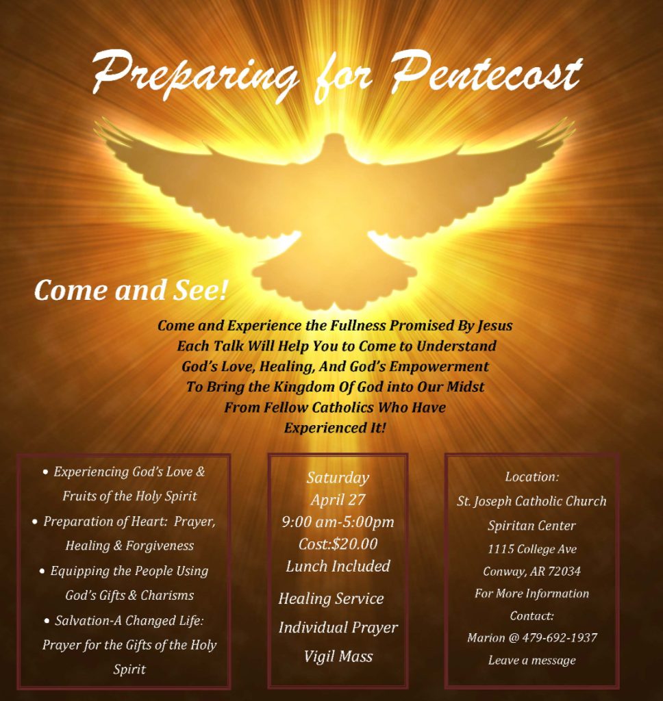 Do you want more of the Holy Spirit!!! We will be having a special event on April 27th, Preparing For Pentecost. This is for everyone!  All the information is on the attached flyer. Use the attached registration slip. Online registration will be available after Friday, March 8. Please share this information with your prayer groups and all who need prayer and blessings. Hope to see you there!